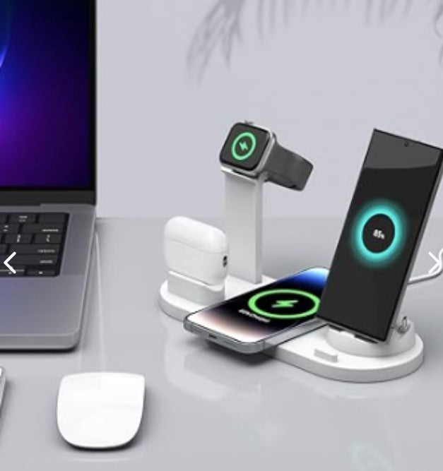 Este dispositivo es una solución de carga multifuncional diseñada para cargar de manera inalámbrica hasta cuatro dispositivos simultáneamente. Su diseño compacto y elegante lo convierte en un accesorio ideal para mantener tus dispositivos organizados y listos para usar.